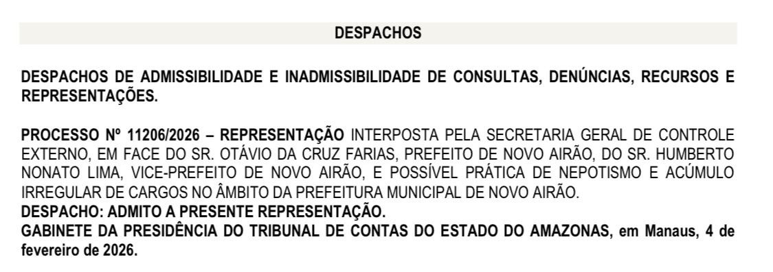 Além disso, o documento foi publicado no Diário Oficial do TCE-AM nesta quinta-feira, 5 de fevereiro de 2026. Segundo a representação, há indícios de contratações de parentes para cargos públicos.